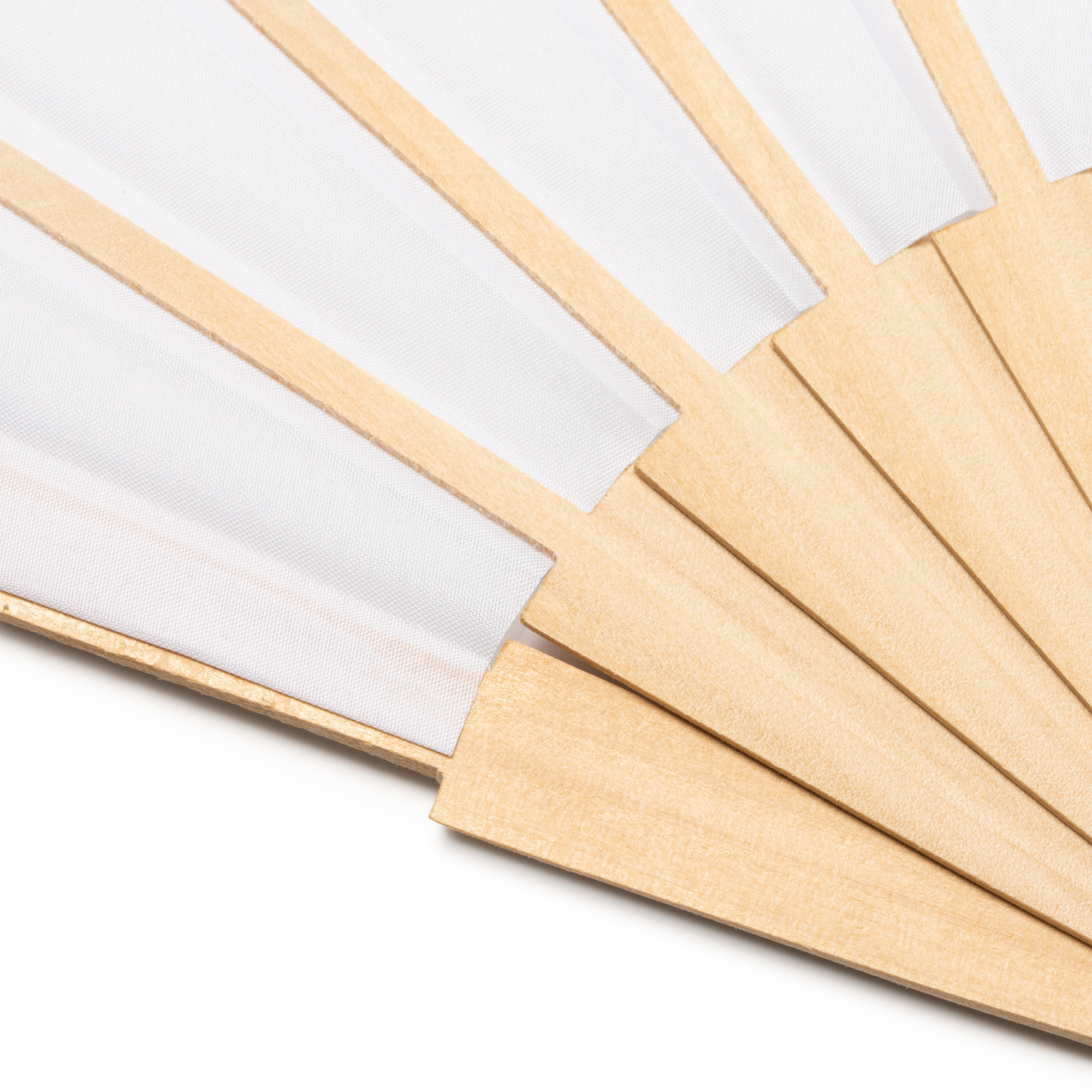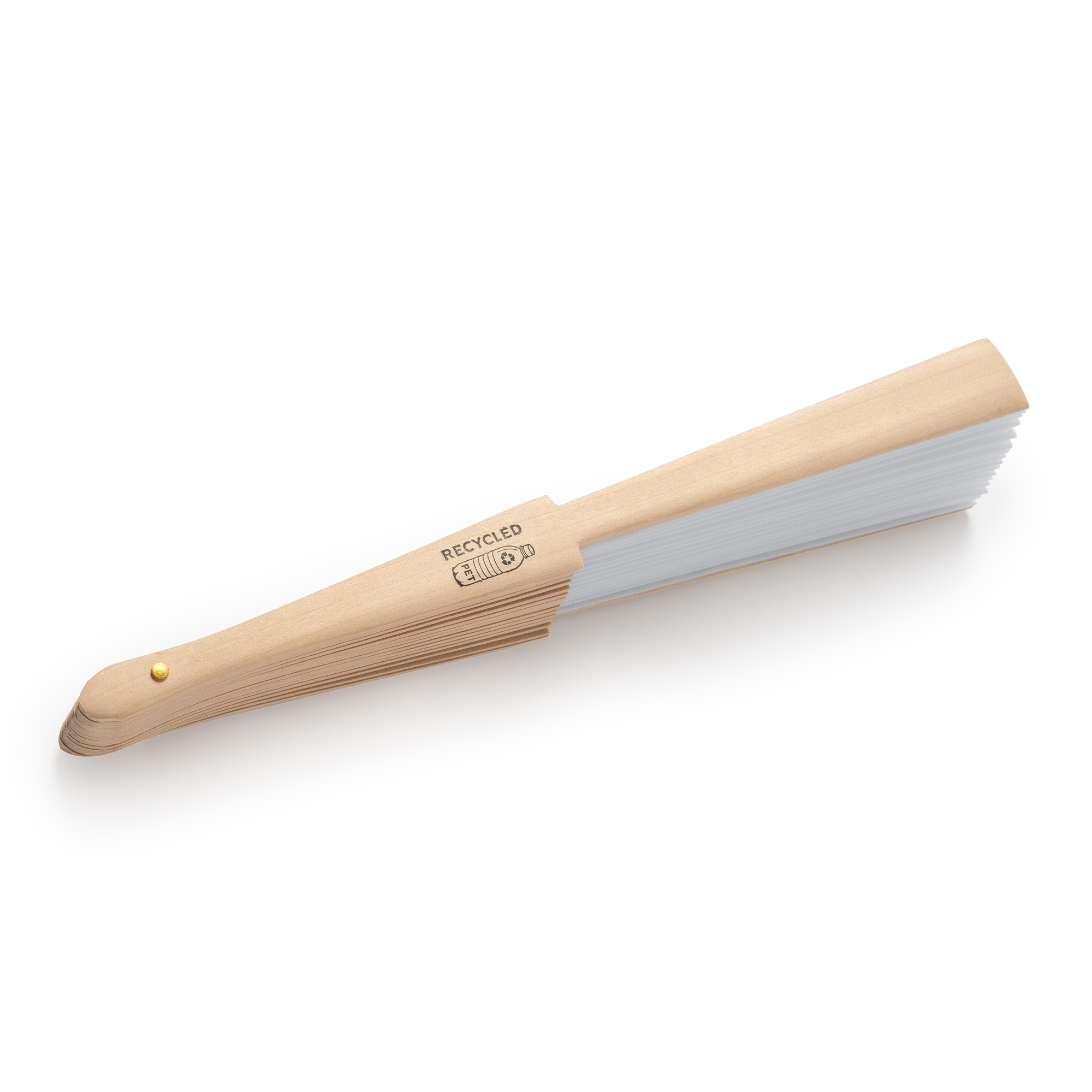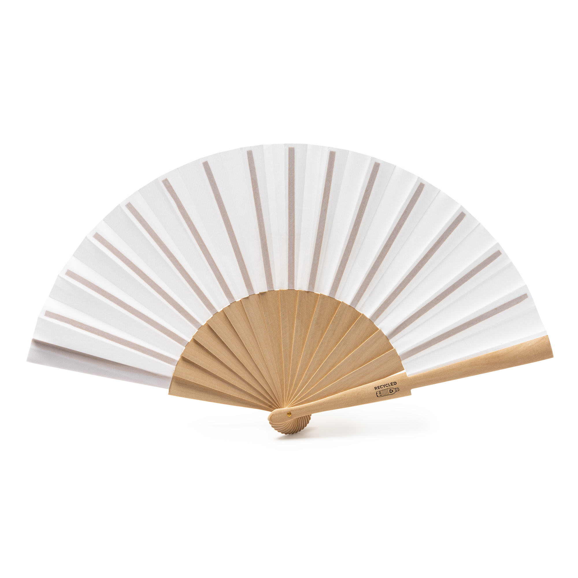 Abanico con varillas de madera y tela en RPET. Idóneo para tener aire fresco los días calurosos de verano.